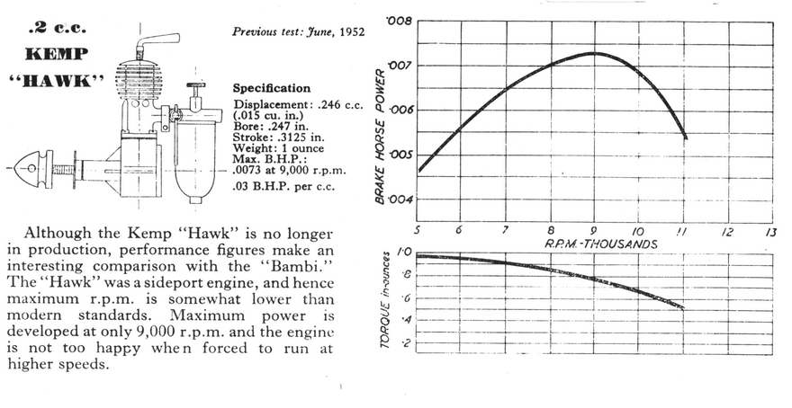 A summary retrospective test of one of the Mk I Series III models may be found in the August 1954 edition of Aeromodeller magazine, where it appeared in conjunction with the test of the Allbon Bambi in that issue. The reported output was .0073 BHP, which slightly exceeded that recorded for the admittedly smaller and lighter Bambi (.0065 BHP). However, the Hawk evidently peaked at around 9,000 rpm as opposed to the Bambi's peaking speed of 12,500 rpm. Clearly, as we might expect, the Hawk developed considerably more useable torque than the Bambi and would therefore swing a more efficient airscrew for practical purposes. The test report commented that the Hawk was unhappy at being pushed beyond the peak, a not uncommon characteristic of sideport engines.