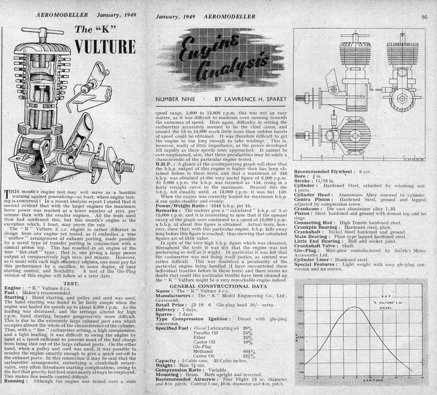 Lawrence Sparey's test of the Vulture appeared in the January 1949 issue of Aeromodeller magazine as number 9 of the series of 47 tests that Sparey was destined to carry out for the magazine over a four-year period beginning in May of 1948. Allowing for editorial lead time, the publication date of this test reflects unusually quick work by Sparey, since the Vulture had only been on the market for a few months at the time of the actual test. Sparey must have been remarkably quick off the mark in obtaining his test example, or perhaps the publicity-minded Len Steward ensured that he got one of the first engines off the line.