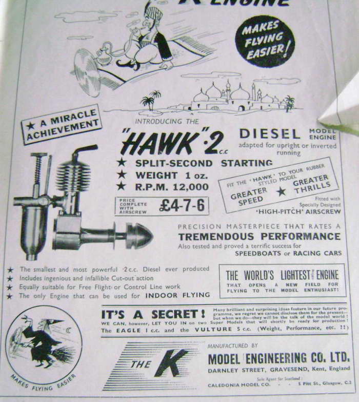 The first hint of what was to come was dropped in an initial advertisement by the new company which appeared in the 1948 issue of the compendium Model Aviation. The exact date of this publication is uncertain, but the advertisement must have been placed shortly after the change in the ownership structure of the company. It focused upon the little sideport K (formerly Kemp) Hawk which remained in production, presumably to maintain a cash flow while new models were developed. However, there was also a rather cloak-and-dagger reference to a pair of new models which would shortly be appearing—the 1 cc Eagle in its FRV form and the 5 cc Vulture. No details were provided, but the advertisement claimed that these two forthcoming designs would be "the talk of the model world!" Quite an advance billing to live up to!