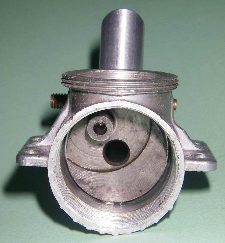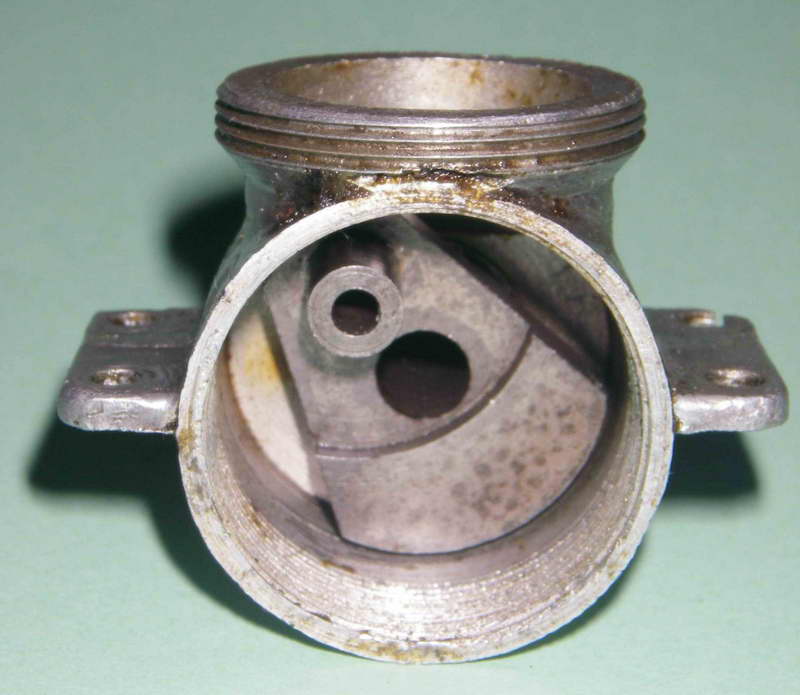 Looking now at the main crankcase casting, we find ourselves confronted with a few more weak points in this engine's design. The 26 TPI threads on the upper part of the case onto which the dog collar screwed were apparently formed using a large Coventry die-head. This forced the designer to keep the rest of the casting below the level of these threads so that nothing would foul the die-head. Accordingly, the downdraft intake venturi was not cast integrally with the main case but was instead a separate component of turned alloy which plugged into a stub boss on top of the integrally-cast main bearing housing and was retained in position by the spraybar.