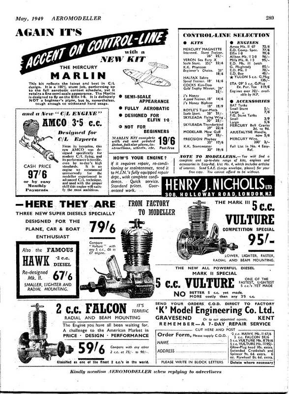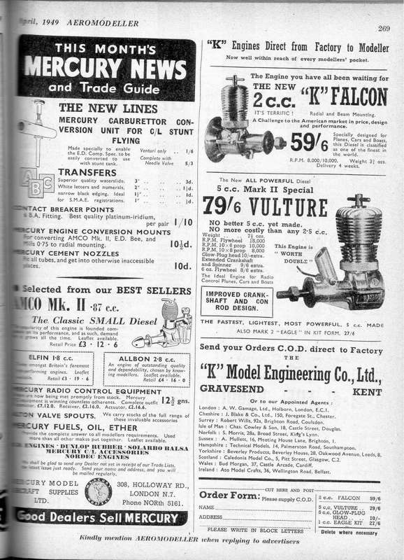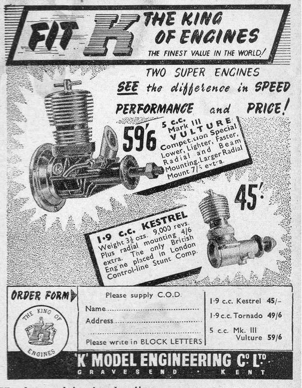 By May of 1950 it appears that all of the 900 examples of the Mk II Vulture had finally been sold, since from that point onwards the company's regular advertisement in Aeromodeller offered only the Mk III variant. It's actually likely that production of that model too had not continued into 1950 and that they were simply selling off unsold examples at this stage. The far more user-friendly 2 cc Kestrel diesel and Tornado glow models were the only other K models offered at this point—the FRV Hawk models had been dropped in 1949 and the Falcon made its final appearance in a February 1950 advertisement, ironically just after the appearance of its only published test in the January 1950 issue of Model Aircraft