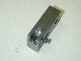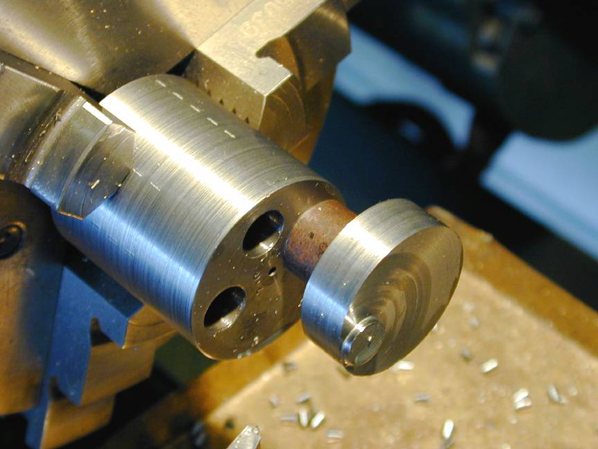 No, not the chamber for a home made four-shooter, this is a simple fixture for turning crankpins with minor variations in throw. The original plans called for a 0.700" throw. Somehow, I goofed (again) and ended up with a fixture that produced .740" of throw. This required thinning the rod and finally, grinding away the case for additional rod clearance. For the "production run" I did not want to have to do this, so the fixture got additional holes made to put the throw in the right place and while I was at it, to give a little less throw (0.680"). Obviously, the fixture (steel in this case) is drilled and reamed off center by one half the total throw required. Common practice is to either slit the fixture so the chuck supplies clamping force, or to put set screws with soft shaft protecting pads under them to prevent the rod turning in the fixture. A much simpler and more secure solution is to use a nut (1/4-28 in this case) to make the crank hold itself in the jig. The spacer is needed because the scrap I used was too short overall.