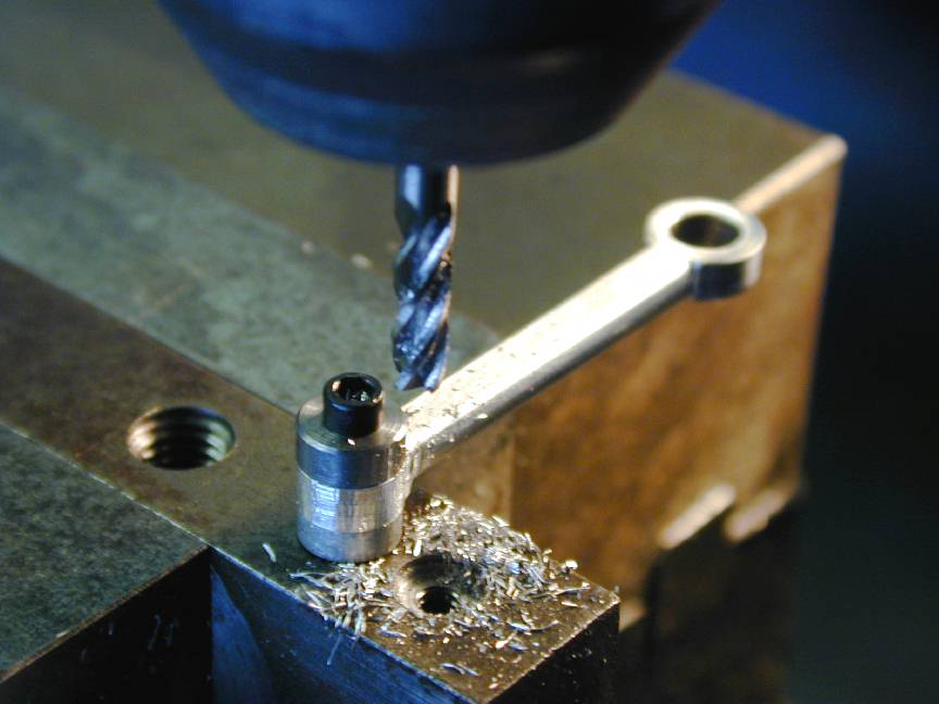 The same jig is used to hold the shaft vertically under the mill to machine out the web counterbalance. Here we see it just before this step. The spacer under the web provides tool clearance for the 3/4" end mill that will cut the crescents out.