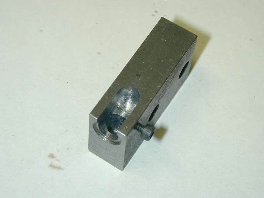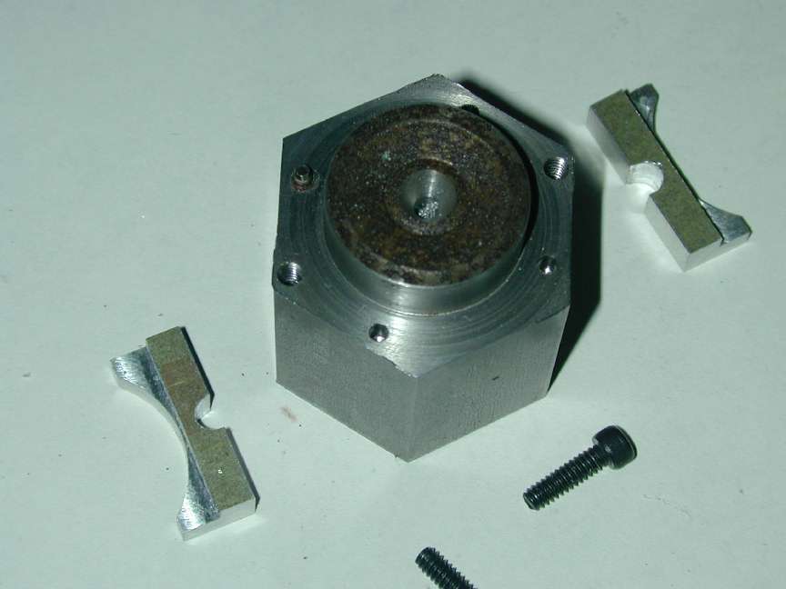 The cylinder lap is my standard aluminium, spilt lap, expanded by a screw in a hole threaded with a #1 (taper) tap. Crude, but works very well giving surprisingly fine, incremental adjustment. The expertly made and lovingly finished (??!) cylinder holder is a drilled and split block that slips over the bare cylinder. The operator provides the clamping pressure by gentle squeezing. This lap got quite chewed up on burrs left inside the bore following port cutting. The bore is nominally 31/32", not a size reamer I have, but I may "invest" so I can size them (by floating in the reamer) and also use it to clear any burrs before lapping (for detailed words on lapping and lap charging, see the Weaver Construction Log).