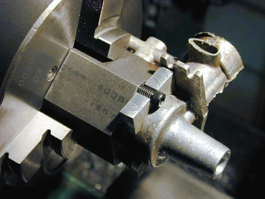 Here's a reject case being used to test the fixture. The kindest term for the "metal" used in the casting is "pot metal", so called because it could have come from melted down pots and pans. It's sorta grey and comes off in grains rather than curls. Still, with a really sharp tool and lots of suds, it can be machined ok. Normal procedure is to drill and ream a case. Unfortunately, a lot of the cases have been drilled by a previous project custodian, centered in the end of the protrusion which means the bore is NOT concentric with the case cavity due to the distortion mentioned above. These can be fixed by boring oversize until the eccentricity disappears. The down side is they require a non-standard bushing be custom fitted. I'm certainly not going to get rich on this job.