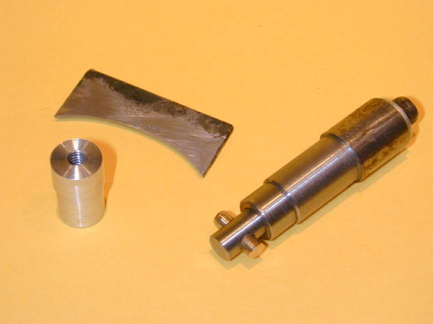 The T shaped thinggy is used to hold pistons for final turning and honing. The cross-drilled shaft telescopes inside the stepped outer body. When making pistons, the interior of a cast iron blank is finish machined, then drilled and reamed for the wrist pin (or "gudgeon" pin if you are of the British persuasion). The brass pin engages in the wrist pin holes and is pulled back by the socket head screw, pulling the piston interior step onto the top of the jig. Obviously the fixture needs to be removed from the chuck to change the piston, but as final turning is done using this jig, this presents no great problem. The small aluminium mandrel in this photo is machined with a 1 degree taper for a press fit in the interior of the contra pistons. This holds them for OD turning and finishing per the "David Owen, Sure-Fire Contra-Piston Fit" method described in the Taplin Twin Construction feature. The fixture is drilled and threaded so a screw can be inserted to pop the C-P off the mandrel when fitting is complete. The curved plate is a form tool used to finish the spinner nuts.
