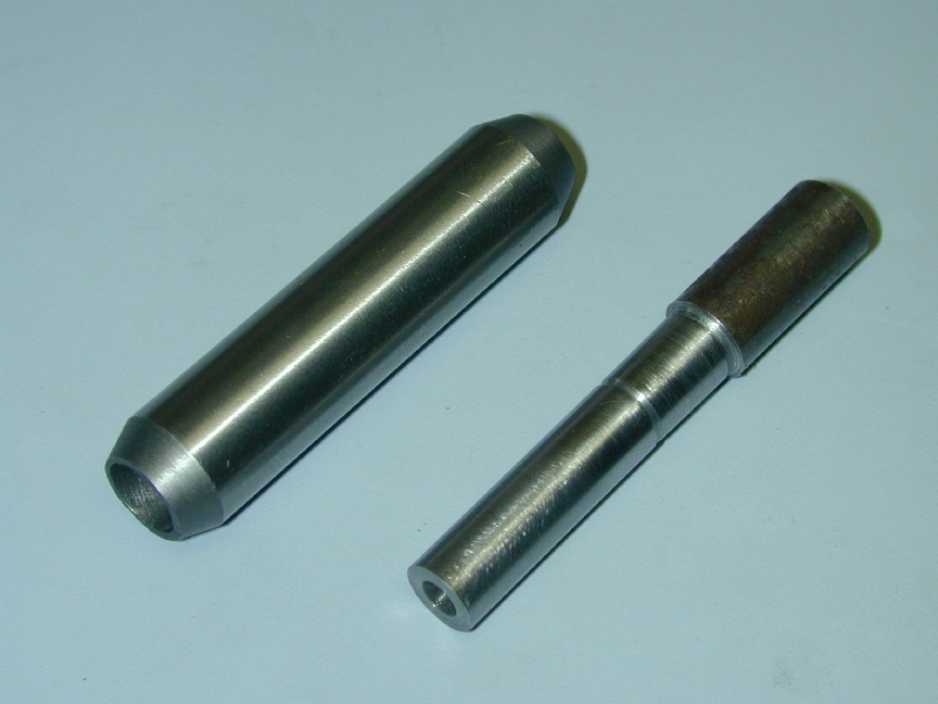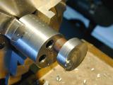 For a long time, I thought tapered mandrels had to taper over their entire length (stop laughing!)—finally I found out better from a throw-away line in an SIC article. Now it makes sense. Taper mandrels are used to hold work that is finished internally and needs the outside turned with a high degree of concentricity. The production AHC's will use re-worked cast iron valve guides as main bearings. This relieves me of the effort required to ream the bush. That's one in this photo. Each guide will produce two bushes. The mandrel is a close sliding fit in the bush at the front, produced by turning between centers. The undercut leads into the actual tapered part of the mandrel which tapers at about 1.5 degrees included, going from under the bush ID (5/16"), to just over the ID, so that the bush jams tight about half way along the tapered section. The OD can then be turned (between centers) to give a high degree of concentricity. Note that all cutting forces tend to push the work further onto the mandrel. As we are working between centers, the work and mandrel can easily be removed from the lathe for testing in the case hole and replaced for further machining with no loss of precision. A sleeve is finally used to tap the finished bush from the taper.