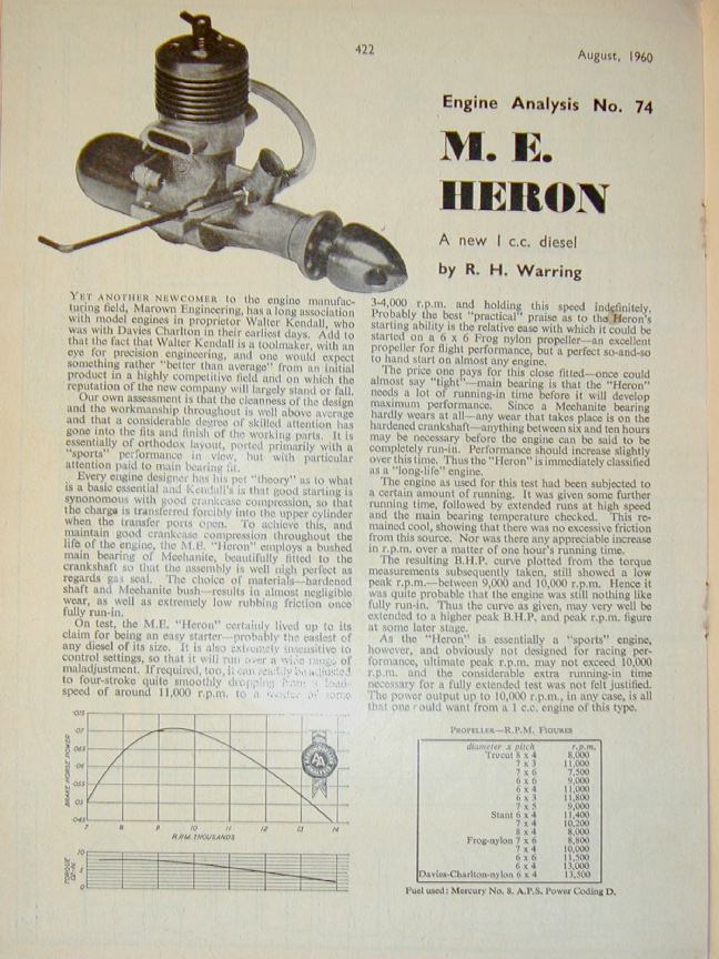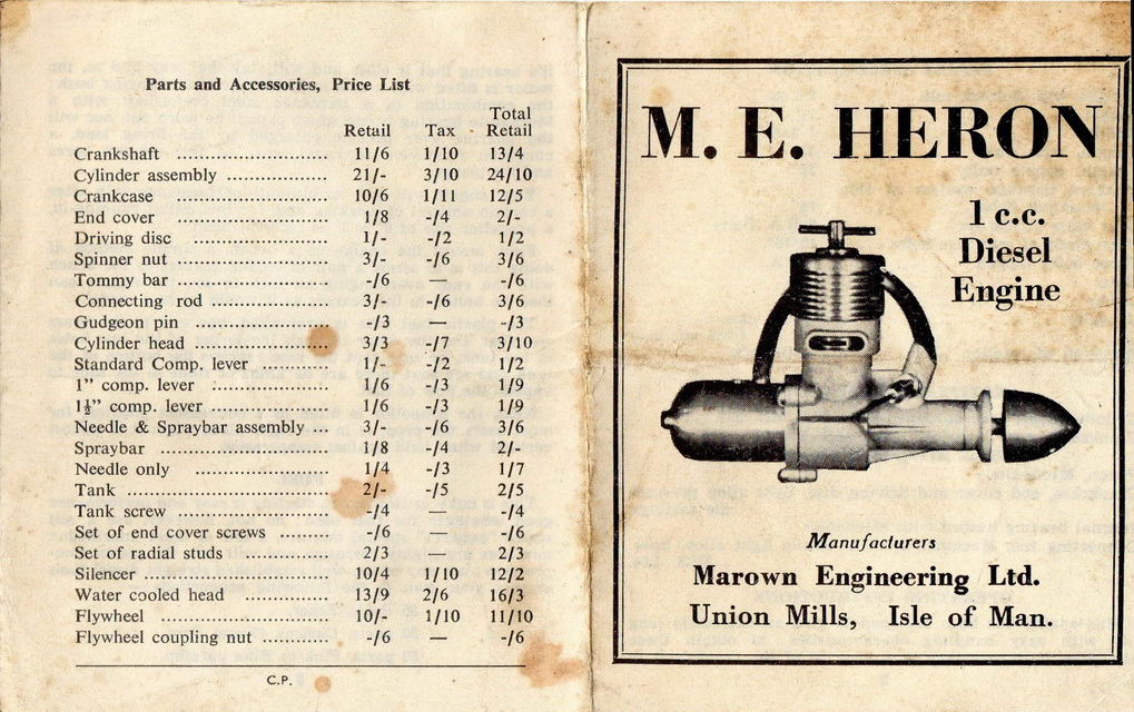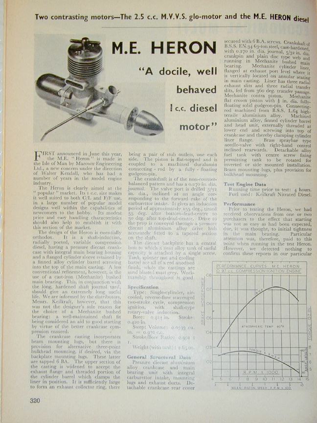 In the about the middle of the year 1960, "Marown Engineering Ltd" of Glen Vine, Isle of Man—better known and universally referred to as "M.E."—released the first of their two compression ignition designs by proprietor Walter Kendall. This was the 1cc Heron, to be followed two years later by the 1.5cc Snipe. The Heron was described in the modelling press as "A docile, well behaved 1 cc diesel motor" [1].