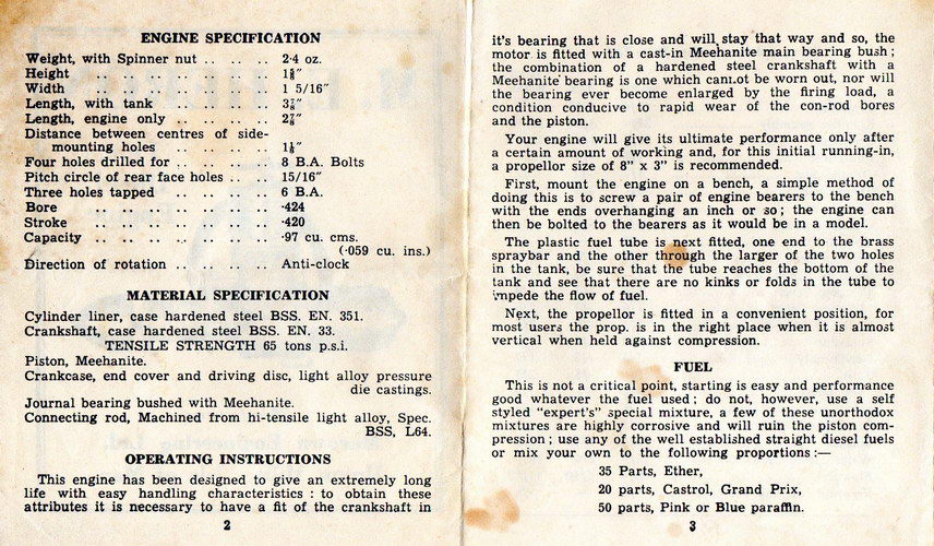 The reviews of the Heron give the bore as 0.424", with a stroke of 0.420" for a capacity of 0.059 cuin, or 0.97 cc. The bare weight of the marine version is 6-1/2 ounces, of which 3-1/2 oz is flywheel. Much of this weight is close to the flywheel axis which Westbury says is not ideal. The aero version weight is given in [4] as 2.4 oz, while [1] states it as 2.65 oz. Performance wise, the Model Aircraft review found the maximum BHP to be 0.072 at 11,500 rpm. Aeromodeller got 0.071 BHP at 9,500 rpm, but felt their example of the engine would benefit from more running.