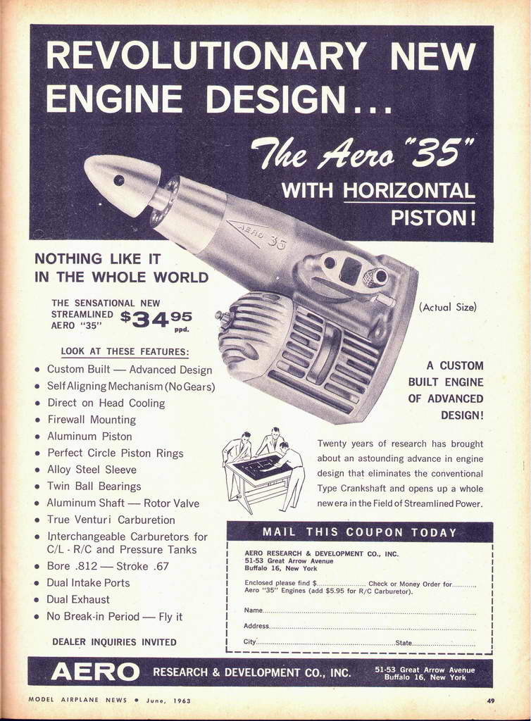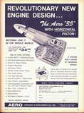 The world of model engines has several noteworthy failures. These engines, while conceptually advanced for their time, were seldom great performers. The Morton M5 five cylinder, four-stroke radial is one; the horizontal piston Aero 35 is unquestionably another. I can relate to why it failed in the market. I was a high school senior when it appeared (or "sixth former", to be more culturally accurate). Like my model making school friends, I read the reviews in US magazines American Modeler [1] and Model Airplane News [2], plus the English ones, the Aeromodeller [3] and Model Aircraft [4][5]. While we were all wow'd by the styling, we were savvy enough to look at the performance figures and price, and conclude that our limited funds would be better spent on a Johnson 35 Stunt Supreme, or even an OS Max! Sadly, that pretty much sums up the collective reception of the modelling world. By the end of 1964, the Aero 35 had disappeared and the stage was set for Yet Another future "collectable" to wait for its real time to arrive.