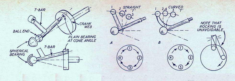 As we'd expect, Chinn concisely summarized the horizontal (aka "axial") piston design options, namely swash-plate, wobble-plate, and cam-plate. He concluded that the engine was none of these, the closest being the wobble-plate. As seen here in a Bristol design from the 1930's, the wobble-plate concept is based on an inclined section of a full crankshaft that carries a "spider" which is prevented from rotating, causing its tips to wobble back and forth as the shaft rotates. Each finger of the spider is connected to a piston by a rod with ball joints at each end. In operation, each rod will describe a figure-8 as it reciprocates. Presumably, the commonality Chinn saw to the Aero was the conical path described by the rotating component. Chinn described the reciprocating to rotary motion translation mechanism of the Aero as being achieved through a "L" shaped connecting rod. Netzeband used the same term, while Ron Warring referred to it as "T" shaped. Of all the descriptions, Warring's was the most detailed and best illustrated.
