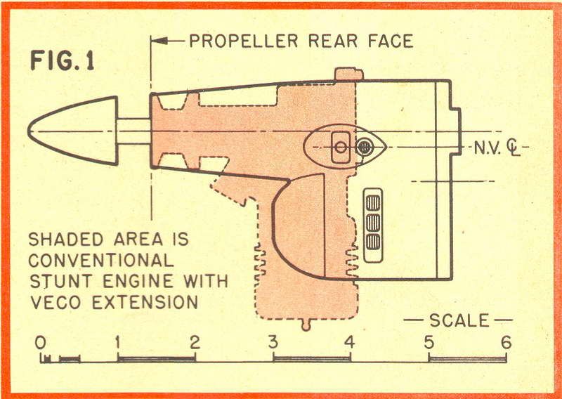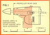 Despite the price disadvantage commented on in the British magazines only, all the modelling press raved over the engine, Chinn raved three times and I can find almost no sign of replication in the text of his two Atlantic spanning reviews. This is quite a feat when searching for words to explain a totally new concept! The side view drawing from American Modeler shows a Fox 35 with shaft extension for comparison. The height reduction is about 20%; significant, but notice that the engine is considerably longer. Price aside, the weight difference is the killer. The Aero weighs 10.6 ounces. Compare that to 6.5 ounces for the Fox, or 7.5 for the Johnson SS. Bolt that onto the firewall of your stunter and you have a bad center of gravity problem requiring tail weight. Move the firewall back and you've got a tank accommodation problem. Going to look great though. Oddly, not one of the reviews comments on this rather obvious fact. Maybe they wanted to like the engine. Then again, editorial policy towards advertisers may have been a factor too.