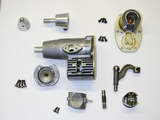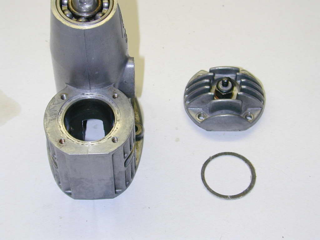 The engine is very well made. The crankcase is a very clean die-casting, with the cast iron liner cast in. It carries two ball races that support an aluminium crankshaft (and why not, given the loads involved) with a aluminium prop driver attached by a single grub-screw against a flat on the shaft. The driver also carries the threaded extension (UNF 5/16-24) for the streamlined spinner nut. The head, another pressure die-casting with a truncated cone shaped combustion chamber, is attached by only four 4-40 screws. Note that the gasket on my example, bought on eBay, has well and truly decomposed. The gasket is rather thick, so a new one was cut from 0.010" gasket material and good, bouncy compression was restored.