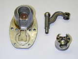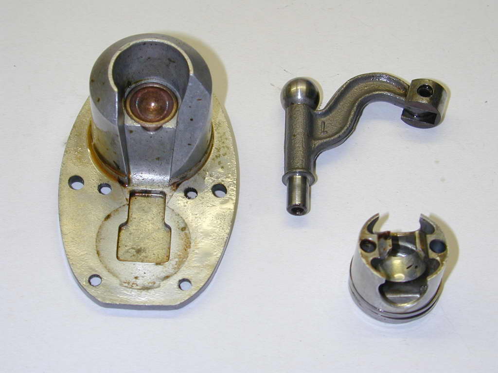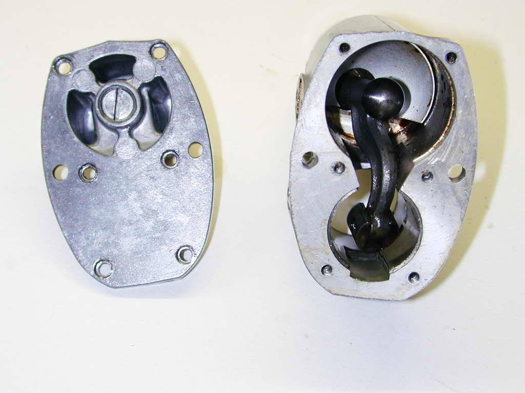 The backplate casting carries a sintered bronze socket for the conrod ball to rotate in. This rests against a set-screw in the rear of the backplate that is adjusted to correctly position the apex of the cone to take up excess free-play and wear in the bushed end (screw in until it stops, then back-off 10-15°). The backplate protrusion into the main crankcase minimises the cavity volume to provide primary compression. It is cut-away for the rod and to provide the gas passage to the bottom transfer passage formed by the lower cut-away section of the liner and a cast-in channel in the bottom of the case. The upper channel which provides passage for the conrod arm is extended to the same length forming another, opposed transfer port.