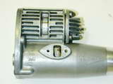 The venturi and needle valve assembly is another unorthodox design. The streamlined carby casting has a rectangular opening with rounded corners. The casting is chamfered to angle inlet slightly into the air stream. The passage tapers and transforms to a 3/16" circular venturi neck, then expands back to a rounded corner rectangle at the crankcase flange. A fuel jet is drilled from the rear at the venturi throat, in line with the rear mounted fuel nipple. Fuel flow to the jet is controlled by a very large diameter, threaded stud with a slight taper on the inner end. The thread is 1/4-56 (!) and the cavity it screws into forms the counterbore for the rear carby mounting screw. As another indication of attention to detail, a tiny, rear facing grub screw presses a nylon pad against the needle thread to provide adjustable friction. The same casting was used the R/C carby which inserted a restricting slide through a hole drilled in the domed protrusion seen at the front of the venturi casting.