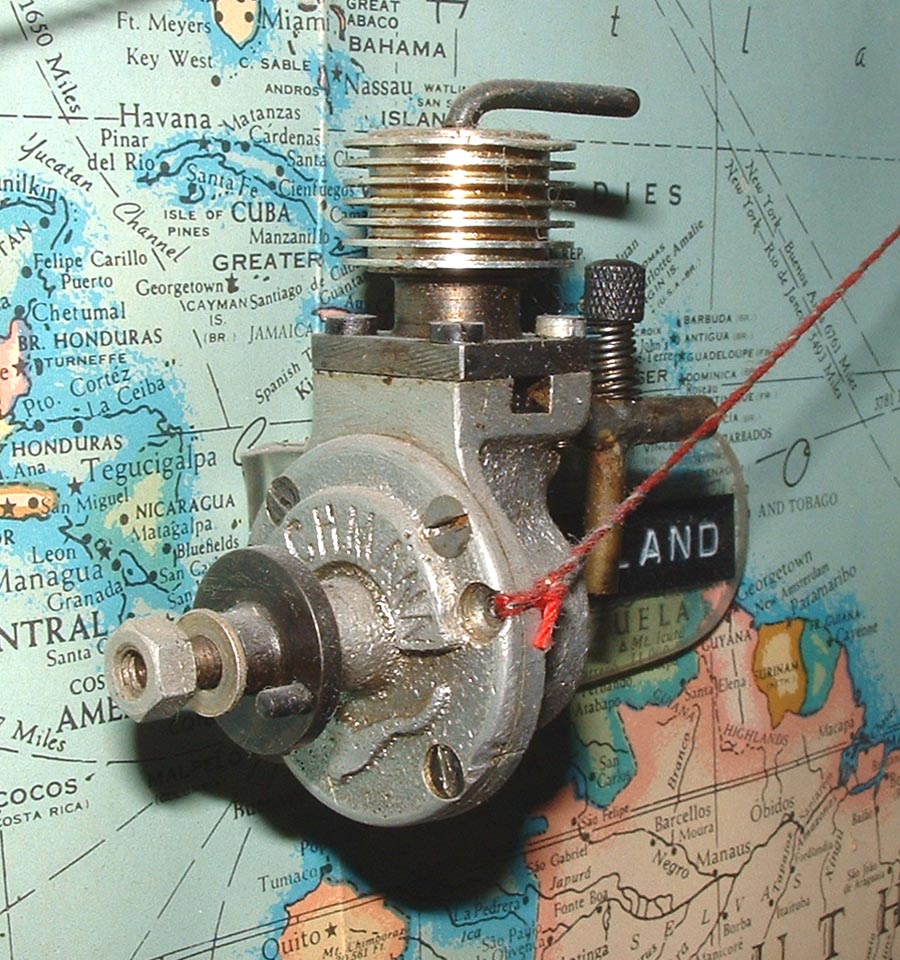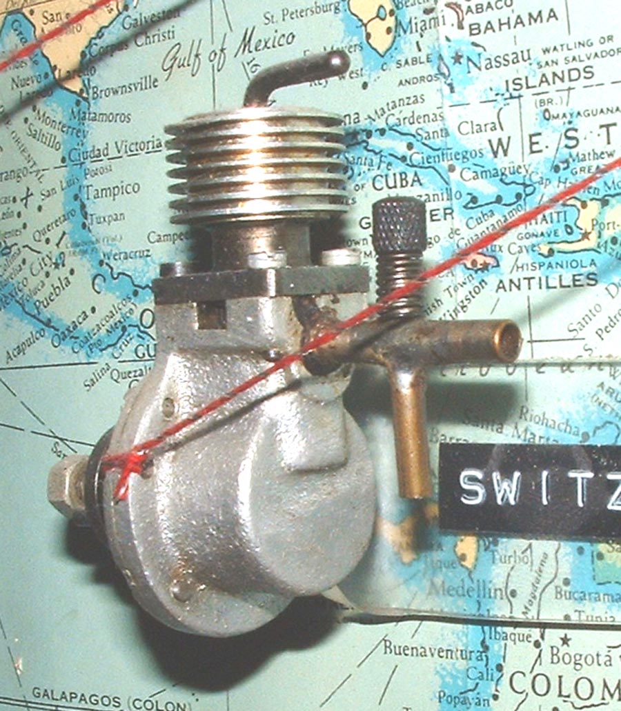 The engine in the pictures is attached to Tim Dannels "World Engines" display board. As far as we know, it is completely original and shows some differences from the "ideal" as depicted in the cut-away drawing. First, the venturi-shaped restrictor insert shown in the end of the inlet pipe of the drawing is absent in Tim's example. We doubt that it dropped out as there are no marks to indicate it was ever there. Its usefullness in that locaton would be questionable anyway--you want the point of minimum pressure (the restriction of the venturi) to coincide with the fuel jet to maximise suction, not be halfway to the cylinder up-stream from it. Next, the drawing shows an insert threaded into the cylinder head to carry the compression screw, with a flange inside the head. Neat idea. Assuming the insert was steel, it adds strength to a stressed component. It also adds to the manufacturing costs and is totally absent from Tim's engine, as are the two holes evident in the top of the head in the drawing--presumably for a tightening pin-spannar.