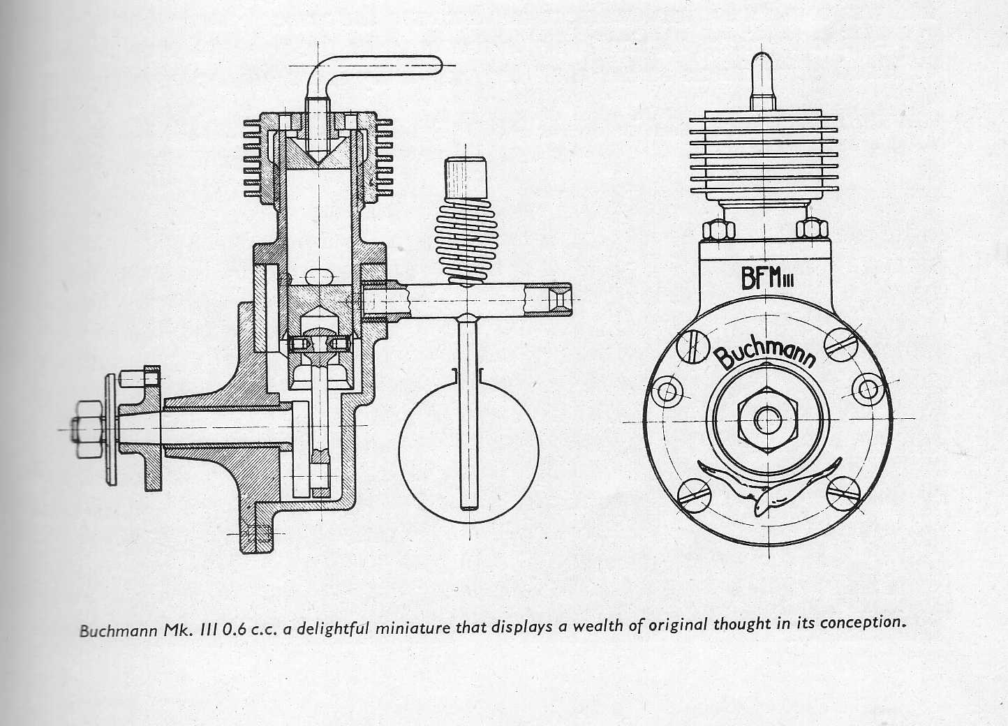 It's now well accepted that the first commercialy available compression ignition--aka "diesel"--engines appeared on the Continent around 1940 in (neutral) Switzerland. The "Etha" is generally acknowledged as being the first, but it was short lived and it's the "Dyno" that gained the most fame. But there was another, and that is the little Buchmann 0.6cc side port. The sectioned drawing here appeared in Laidlaw-Dickson's 1946 book, Model Diesel Engines. Dickie does not say a lot about the engine, apart from noting its unusual mounting method and saying that it, unlike the Etha, is (was) still available. It is identified as the "Mk III", but there is no indication that other engines preceeded it.