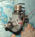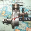 The cut-away is more revealing, as it shows how the designer managed to cram a long stroke design into a very small package: notice the crankshaft? It's like a crank-handle. The side opposite the crankpin has been completely turned away. Then, by using a short con rod, the piston at bottom dead center (BDC) descends into the volume normally occupied by the crank web, allowing the overall height to be minimised. The down-side is that we've now purposly created the optimum out-of-balance situation. At 0.6cc, on a slow revving "long-stroke" side-port, this is probably no big deal, but the technique would not scale well (and for trivia buffs, the English "EPC Moth" used a crankshaft just like this too).