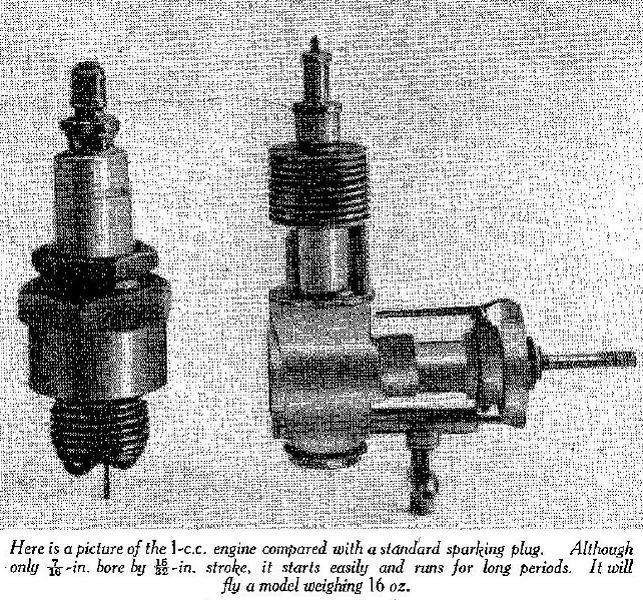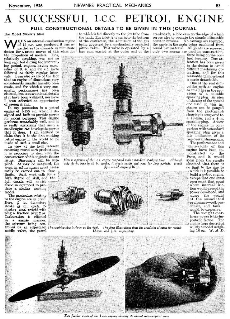 In the November 1936 issue, an article appeared titled A Successful 1~c.c. Petrol Engine, by one "W.H.D.". This described an engine of 1.15cc displacement, constructed by the author "for model purposes" and featured a photo of the engine posed beside a standard spark-plug of the day, highlighting its diminutive size. Although the title banner proclaimed that the full construction details were to appear in NPM, over a year was to pass before the series commenced. Nevertheless, this was a pioneering effort in small gas engine design and construction.
