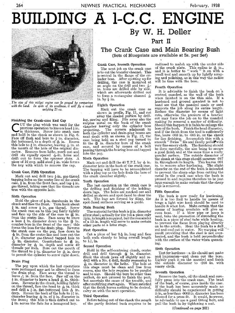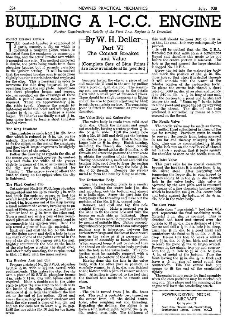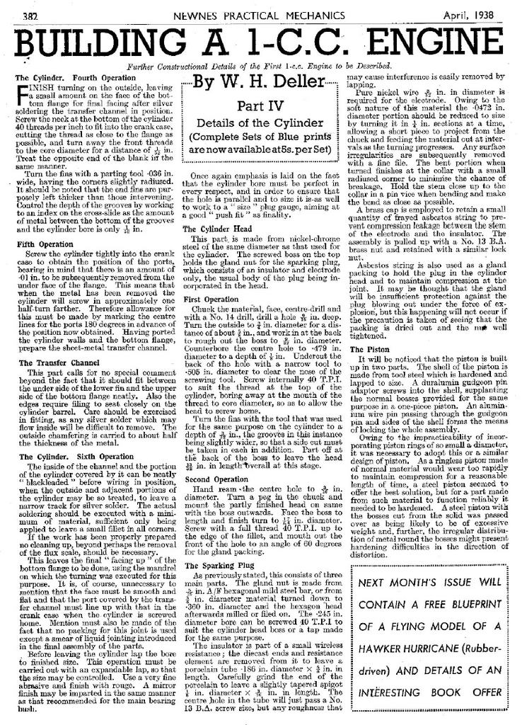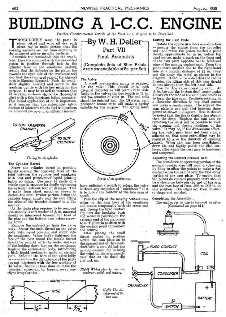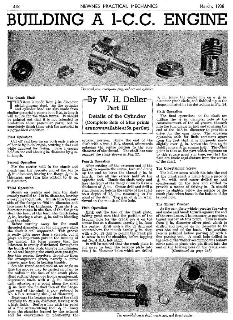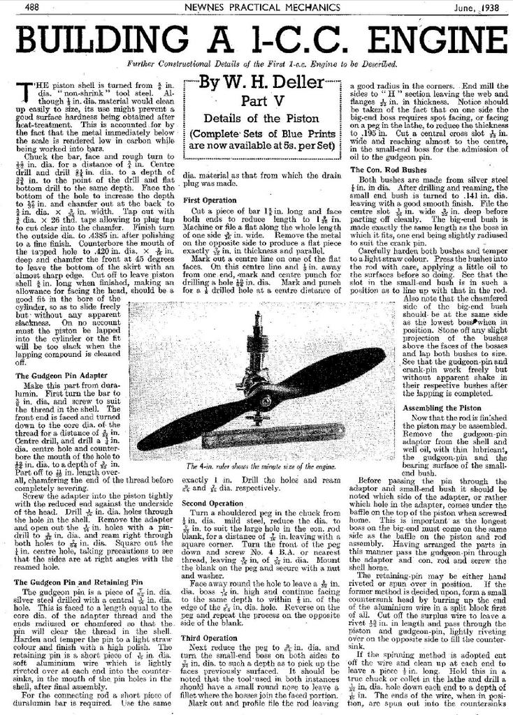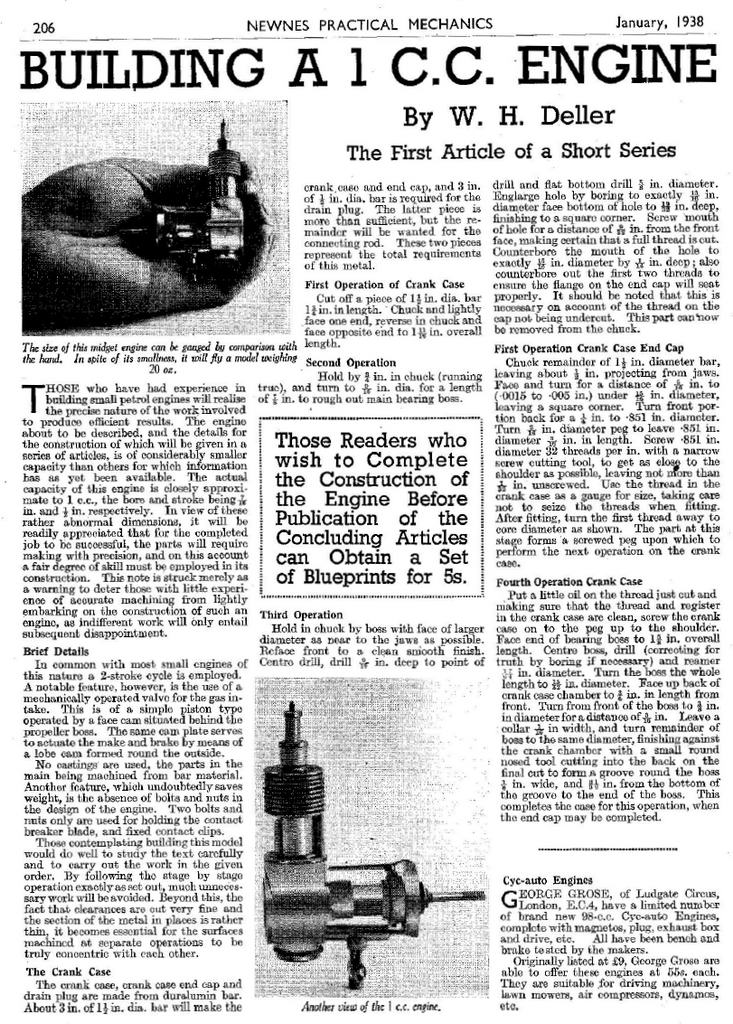 It is interesting to note that in November 1937, plans for Irwin Ohlsson's 0.12 cuin engine had appeared in the American magazine Popular Mechanics (part of the Hurst stable of publications) [1]. I would doubt, given the speed of communications at the time, that the editor of Practical Mechanics was even aware of this fact, so "me too" rivalry is unlikely. Still, the publications are contemporaneous, and with the Deller's displacement being about half that of the Ohlsson, a "ours is smaller than yours" bit of one-upmanship is possible.