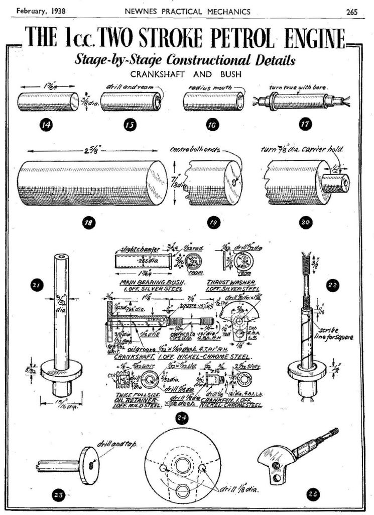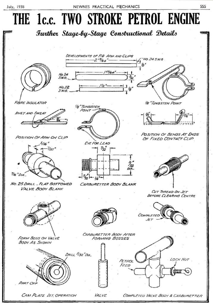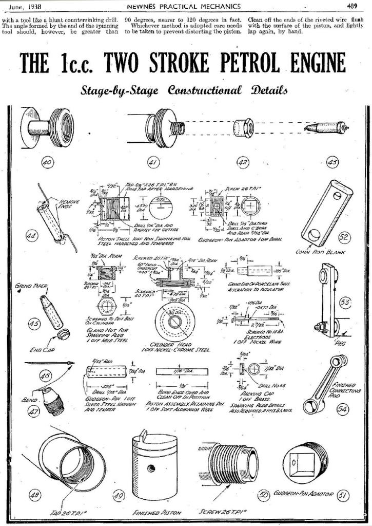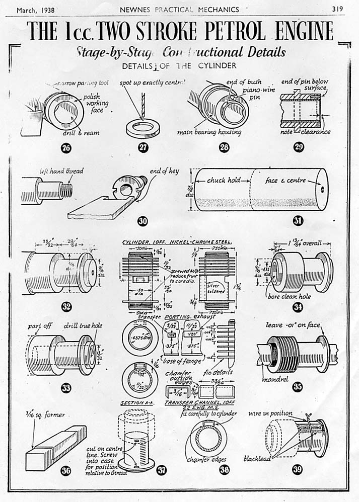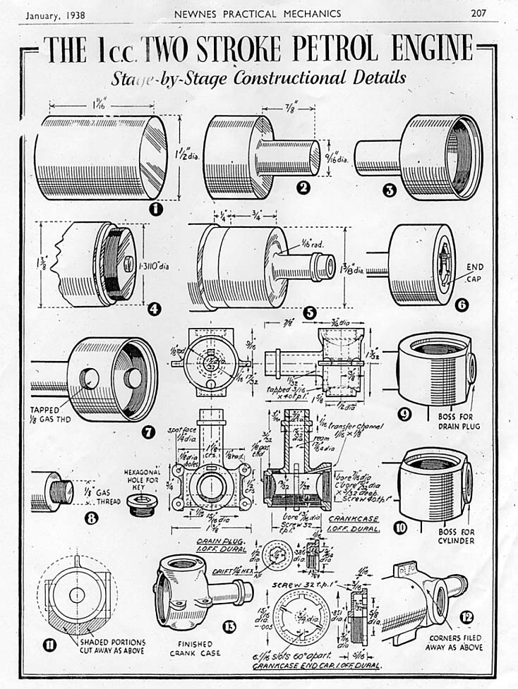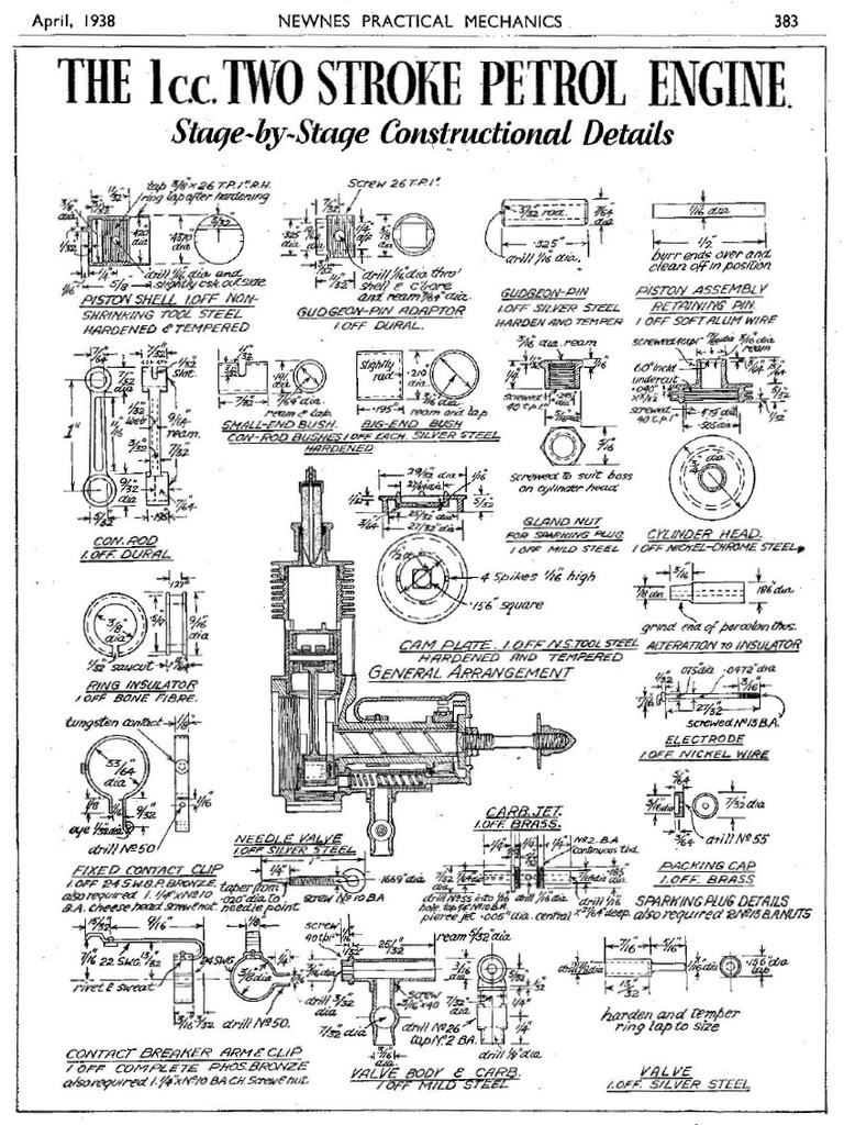 In January 1938, NPM began a six part series on the construction of a 1cc, two-stroke, spark ignition engine for home construction designed by one WH Deller—obviously the "W.H.D." from the November 1936 issue. The engine was designed to be built completely from the plans, with no castings required. A side-bar advised builders not wishing to wait for all parts to appear that blueprints could be purchased for five shillings. That may have been a wise purchase as the magazine "plans", while most attractive and beautifully drawn, are not quite what one might expect in an engineering drawing, with conflicting sizes given for minor details like the cylinder bore! For the curious, links to complete scans of the plans and instructions appear below and we thank John Bell (UK) for providing the complete set.