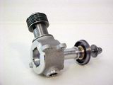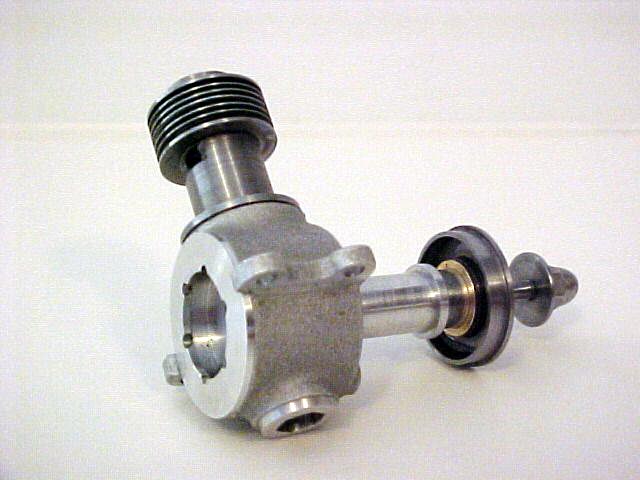 The Deller contains a number of innovations that set it apart from other designs. First of these is the dual purpose cam machined onto the back face of the prop driver. This is best understood from the sectioned General Arrangement detail. The "carburetor body" is a T-shaped tube open at all ends. One end of the T cross-piece threads into the crankcase cavity, while the vertical part forms an "up-draft" inlet. A spring loaded plunger is then inserted into the forward facing opening where it rides in contact with the rear face of the prop driver/cam. The cam cut-out allows this plunger to open the inlet around TDC. Another cam machined onto the perimeter of the driver (and not obvious on the drawing) operates the points.