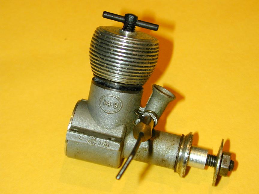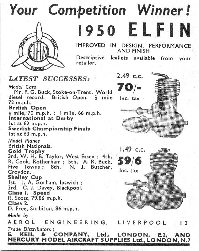 Page back through Aermodeller of the 1950's and you'll see that the Elfin 149 was sweeping the field for free flight power models in its class (the capacity limit for the class was 1.51cc, so you can see why manufacturers were careful to specify their engines just under the limit). The Elfin range was produced by Aerol Engineering Pty Ltd of Henry Street, Liverpool, England during the 1950's. They made the most delightful, lightweight plain bearing engines of capacity 1.8cc, 1.49cc and 2.49cc, and a corresponding series of twin ball race engines that some would assert are remarkably ugly and overweight--sort of like a plumber's T fitting with a prop at the front.