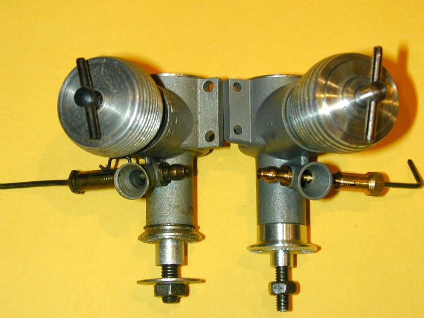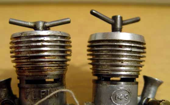 From the top, the differences are quite apparent in the mounting lugs, mounting hole spacing and prop driver boss. Detail on the needle valve differs and the original carries a music-wire friction device, as well as being slit to close-up the thread; the repro is knurled and is slit only. The different length overall is apparent, but not apparent is the screwed in stud for the prop nut on the repro--the original following common practice for the time, is integral with the shaft. I much prefer the stud feature on a working engine as a "crash-survival" precaution.
