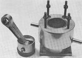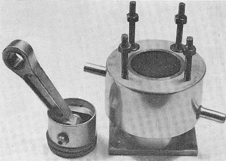 The cylinder comprises a machined D.T.D. 424 casting forming the water jacket and crankcase mounting flange into which is fitted a Meehanite wet liner. Water inlet and outlet stubs are fixed with what appears to be an epoxy resin sealant. The piston is also machined from an aluminium casting, has a flat crown and is equipped with two 1/16 in. compression rings. It has a hardened, fully floating gudgeon-pin with brass end-pads. The connecting rod, again of sandcast aluminium, has a phosphor-bronze bushed big-end and a plain little end and both ends have oil holes.