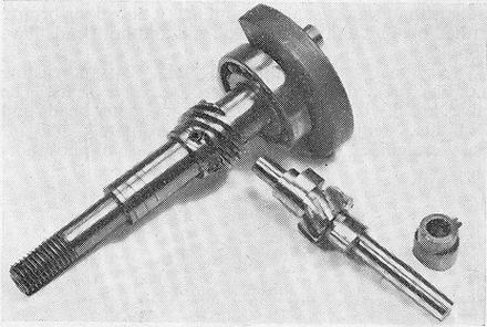 The Gannet crankcase is a substantial sand-casting in D.T.D. 424 aluminium alloy, complete with integral main bearing housing and camshaft housing. The counterbalanced crankshaft is machined from a steel forging with a separate, hardened, tin. dia. crankpin. The shaft has a tin. dia. rear journal, where it is carried in a It in. o.d. ball bearing, while at the front end, journal diameter is reduced to 7/16 in. and runs in a phosphor bronze bush. Ahead of this, the shaft is reduced to 5/16 in. dia. on which a steel split taper collet is mounted, carrying the flywheel. The flywheel is of nickel-plated mild steel. 27/8 in. nominal diameter, and is retained by a 5/16 in. BSF nut.