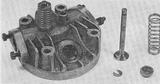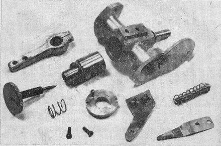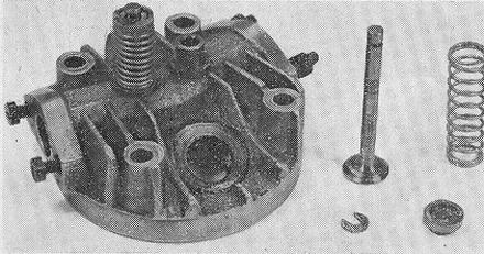 The cylinder-head is another D.T.D. 424 sand casting and has pressed-in phosphor-bronze valve seats. The valves are of 100-ton steel with 3/8 in. diameter heads and 1/8 in. dia. stems. Valve lift is approximately .090 in. The valve guides, pressed into the head, are of phosphor-bronze. Valve spring retention is by means of a horseshoe cotter which engages a groove in the valve stem and is retained by a counterbore in the spring collar. The hardened rocker arms are mounted on eccentric bearings on a cross shaft to provide for tappet adjustment. Pushrods are 7/64 in. dia. hardened steel. The suction feed carburettor has a cast aluminium body, a brass throttle barrel and a 1/4 in. dia. choke. Mixture strength adjustment is by means of the usual needle-valve and the needle is arranged to drop as the throttle is closed and so avoid an excessively rich idling mixture. The carburettor is provided with a choke flap for starting.