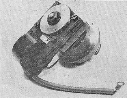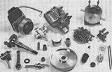 The magneto employs a high flux rotary magnet of 1-7/16 in. dia. mounted on a tin. dia. silver steel shaft which conveys the drive from the crankpin and runs in two Oilite bearings in the crankcase cover. This latter is of cast aluminium and includes a rectangular flange to which the stator limbs and condenser are attached. The magneto supplies h.t. current to a 'full-size' 10 mm. short-reach sparking-plug, timed by the contact breaker assembly which has tungsten points and is adjustable for advance and retard.