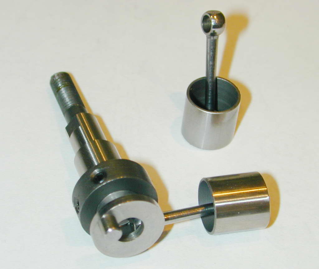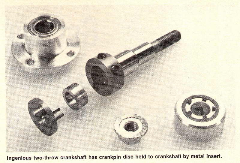 In fact there are two grub-screws. They lock in place an insert disk that sits in a recess in the unusually deep front crank web. The two crank throws are machined integral with the central web. This latter is drilled out to provide some degree of flow between the throws. One of the crankpins is longer than the other and slips into a hole drilled in the front web so that it partially overlaps the central cavity. A crescent relief on the pin allows the disk to both align and lock the central section in place after the front rod has been placed over the crankpin.