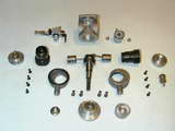 G-Mark's solution to the big-end problem is novel and surprisingly effective. As seen in the manufacturer's exploded illustration, the conrods are quite conventional with a normal big-end and a ball-joint little-end, a'la Cox. Obviously the rear one can just slip on, but as the shaft appears to be solid, how is the front rod attached? A close look at the drawing reveals a grub-screw in the front crank-web that provides a clue.