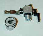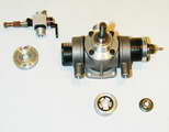 The reed valve is mylar, housed in a cylindrical turning that plugs into the crankcase. It is sealed by another "O" ring and secured by a 2mm cross-point screw whose head is recessed into the rear of the mounting flange. The reed design and its retention spring are again, distinctly Cox (of the "old" pattern). The R/C throttle plugs into the center of this assembly with yet another "O" ring and two cross-point screws. The throttle is quite conventional, being of the "non-compensating" type. It has a fixed air bleed hole and a screw sets the idle limit. Fuel inlet is provided by a neat nylon banjo. Not so neat is the throttle arm. As moulded, this would have interfered with the crankcase, so the tip has been circumcised with side-cutters. This, and the prop nut, are totally out of character with the quality exhibited by rest of the engine, but completely original.
