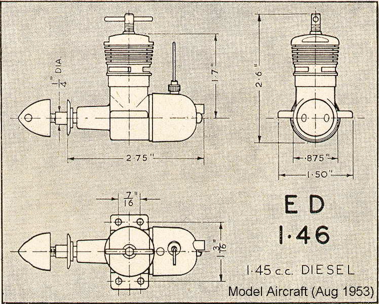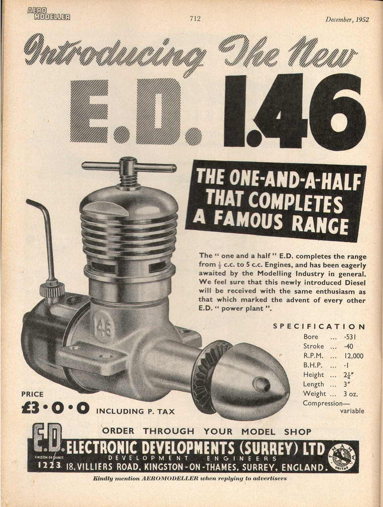 At this time, the engine had not yet been christened and was simply called the "E.D. 1.46". The engine filled a gap in the range for competition classes that called for engines under 1.5cc (hence the slight margin on displacement). The range comprised the 0.46cc "Baby", the 1cc "Bee", the 2cc "Competition Special", the 2.46cc "Racer", the 3.46cc "Hunter", and the 5cc "Miles Special" (seems like someone at ED really liked "point four-six" for some reason).