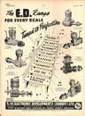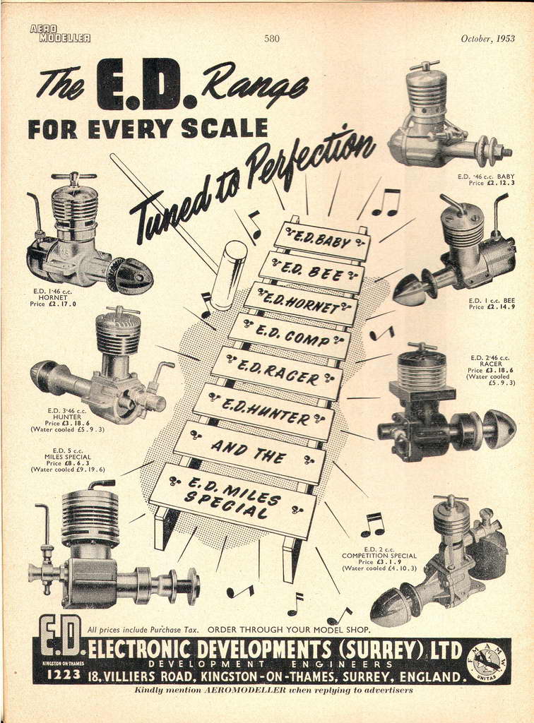 The follow-up campaign was sporadic. No further full-page ads appeared and often, ED chose to feature their R/C gear, engines not being mentioned at all (for a fully detailed history of ED, see the The ED Story). Ron Warring reviewed the engine for the February 1953 issue of Aero Modeller [1]. Rival publication, Model Aircraft carried an anonymous review in their August issue (it is generally believed these anonymous reviews were conducted by Peter Chinn). Whoever he was, the reviewer said that the engine was newly named the "Hornet" [2], a fact born out by the ED ad appearing in the Aero Modeller the following month.
