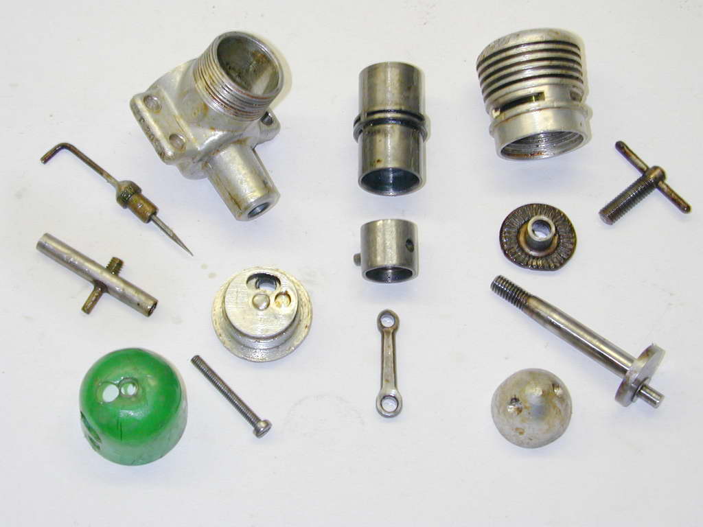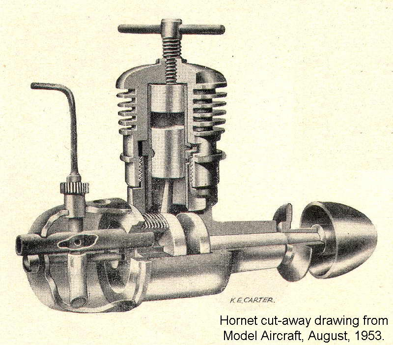 The "Hornet" was a peripherally ported compression ignition engine with rear rotary valve induction, fitted with an integral plastic fuel tank suitable for free-flight use. The 7/32" diameter crankshaft ran un-bushed in the cast aluminium crankcase. Both liner and piston were hardened steel rather than the more normal steel/cast-iron combination (Dick Richards' review says the piston is cast-iron [3], but it is most certainly not on the three examples I examined). The liner dropped into an opening in the crankcase that was 0.020" larger than the liner diameter. It was centered and retained by the cylinder cooling jacket which screwed onto the projection of the crankcase. This resulted in a 0.010" wide peripheral cavity that formed the transfer passage to the three transfer ports located immediately under the cylinder flange. This scheme certainly reduced manufacturing tolerances and operations. It first appeared on the ED 0.46cc "Baby" that had been introduced in April 1952.