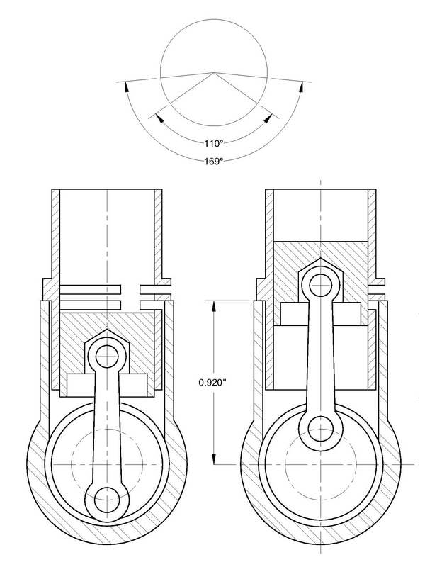 As this drawing, made from measurement taken from a Hornet in my collection shows, ED chose this latter route. The transfer is a respectable 110°, resulting in a gigantic 169° for the exhaust. This early exhaust opening means that we vent pressure well before it has finished doing the work it could have done. This also means that the exhaust exits at a high pressure and hence, velocity. The result should be an engine that is not as powerful as it could be, but with an exhaust note that certainly sounds like a high-powered screamer. The Aero Modeller test figures however don't support this conclusion. The Model Aircraft BHP test figures, although lower, still show an engine equal or better than its contemporary peripheral-ported diesels such as the Frog 150 and Allbon Javelin.