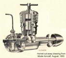 The impressive noise made by the Hornet has already been noted, despite the fact that this is not an especially high revving engine. Like many small RRV engines, it likes a squirt in the ports for starting rather than choking. The Aero Modeller tests found that it gave best performance on an 8x4 prop (wood) and would turn a 12" wood without strain. This makes it a good free-flight engine, especially for scale free flight models with large, round cowlings.The engine is quite easy starting which is good because the tank is a leak that does not have to wait to happen. The best we can say is that the ease of starting means you don't loose the lot before you can get it running and can top the tank up—upon which, fuel will start blowing out the filler hole as well as where the venturi passes through the rear wall! But for all that, it is a delight to handle; flexible in speed range, and insensitive to the needle setting. It does vibrate a bit (the crank not having any attempt at counter-balancing). ED must have noted this as later models came with a stamped arm type compression lock—a most necessary addition in my experience.
