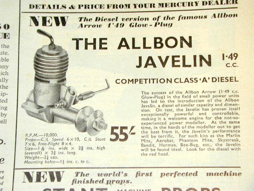 The first advertisement for the Javelin appeared nested in the Mercury Models full page add in the front section of Aeromodeller for February 1950. Earlier advertisements for the Arrow had been placed by Allbon Engineering, mentioning Mercury as the "sole distributor" (the Arrow was praised with feint damns by our friend, Lawerence H Sparey, in the January 1950 Aeromodeller). The Javelin quickly disappeared from Mercury's advertising as they concentrated on their growing kit range, so Allbon once again started placing small adds for the Javelin in the rear of Aeromodeller, though Mercury Models was still identified as their sole distributer. The blue headed Arrow was mentioned as still being available in these adds at the same price, fifty-five shillings, though it silently disappeared in 1951.
