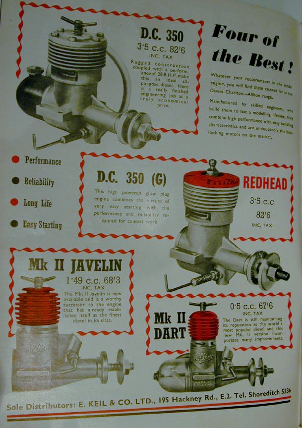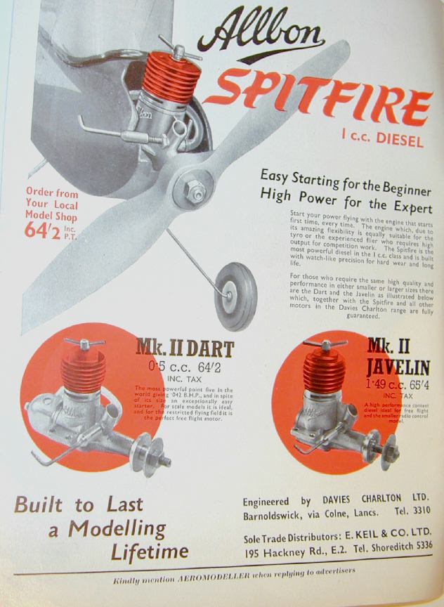 The first add that specifies DC as the "manufacturer" of the "Davies Charlton—Allbon range" appeared in Aeromodeller of February 1953. This add showed the Mk II versions of the Dart and Javelin, together with DC diesel and glow versions of their 350 (later to be redesigned as the Manxman). Note that E Keil is still nominated as the "sole distributor", the price has risen, and the dreaded purchase tax has been added. The ad appeared on the front inside cover of Aeromodeller—a location DC held in that magazine almost until their demise in the 1980's—apart from the December issues where the space was usually reclaimed by Aeromodeller to promote the Annual for the year.