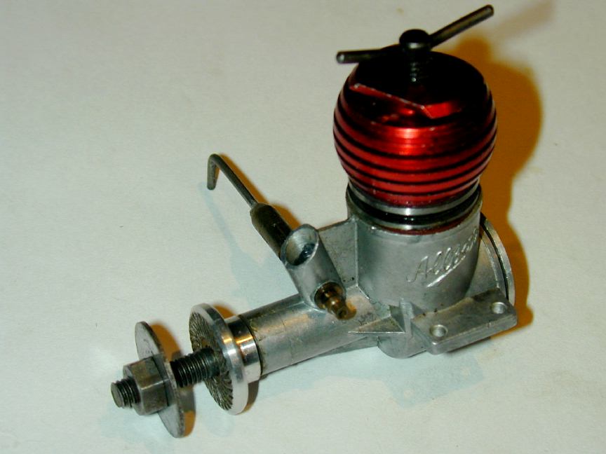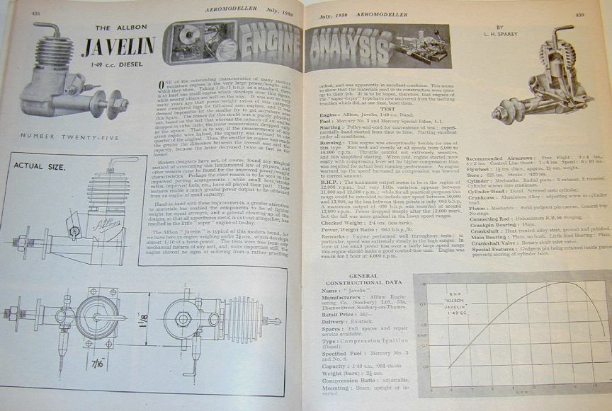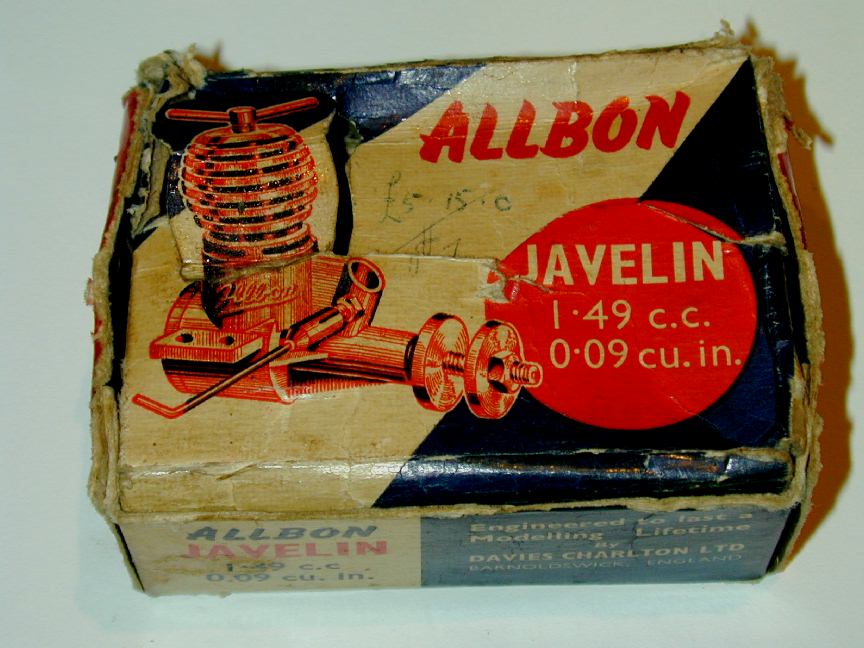 In 1949, Allbon Engineering released their comparatively short-lived 1.49cc Allbon Arrow glow motor. This was followed a couple of months later by the more successful Allbon Javelin, a diesel of the same capacity that utilized the same crankcase. Over the next three years, the range grew with first the 1cc Allbon Spitfire, then the 0.5cc Dart. Judged by the number of plans appearing in Aeromodeller showing one or the other of the engines, the range was well received, with the Dart being especially suited to small free flight scale designs popular at the time (and much sought after for the same purpose today). In 1953, Allbon Engineering merged with Davies Charlton and production moved to the Isle of Mann as already chronicled in the Manxman story. Both Javelin and Dart went through one major design change in late 1952. The revised engines were called "Mk2" although the exterior changes were small. The Javelin Mk2 was, I believe, the inspiration for a number of other engines from other designers in the UK and abroad. Today the engine is comparatively rare, probably due to its very light construction which must have seen literally thousands consigned to the tip due to damage and wear. My example, seen here, is a rare New-In-Box Mk2, circa mid 50's probably (no Allbon's carry serial numbers), and so, alas, too damn valuable to run (grrrr).