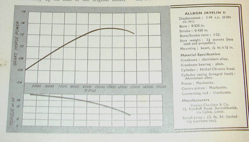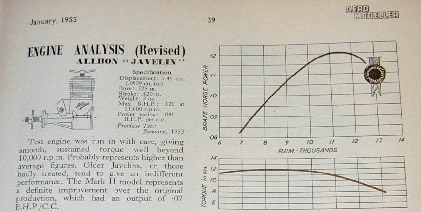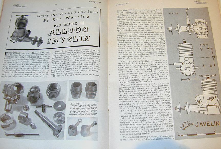 With the release of the Mk2, Aeromodeller re-tested the Javelin in the January 1953 issue. By this time, engine testing had been taken over by Ron Warring with the Javelin being "No. 6 of the New Series". The Warring review ran to three pages and went into detail on the changes, internal and external. The tommy-bar was now "T" shaped (or more correctly, "V" shaped) and the prop driver had been spiral knurled in the direction guaranteed to assist prop-throwing under back-fire conditions (my observation—RW made no comment). Internally, the cylinder design had been revised to place the transfer flutes on the outside, with angled holes emerging between the exhaust ports. This permitted the gudgeon pin and piston—now flat topped—to be more conventional and easier to manufacture. Warring also noted, in delightful British understatement, that this arrangement would no longer be prone to have the screw work loose, thus producing "startling noises". In the test results, the power curves now showed the engine peaking at 11,000 RPM and 0.12 BHP.