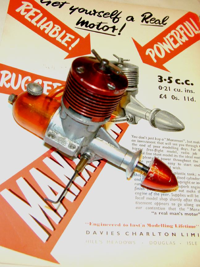 The Manxman is 3.5cc "diesel" produced by Davies-Charlton Limited on the Isle of Man in the mid to late 1950's. It has the same bore, stroke and general appearance of the earlier DC "350", featuring the distinctive "up-draft" intake (or down-draft if you mount it upside down). Although described and advertised as 3.5cc, Ron Warring's test of the engine in the February 1957 Aeromodeller quotes the bore as .680" and stroke as .5625". He goes on to say this gives a displacement of 3.444 cc or 0.21 cuin (compare this with the manufacturer's figures of 3.5 cc and 0.21 cuin). My calculator says 3.348cc and 0.204 cuin. It was not uncommon for British manufacturers to purposly undersize an engine slightly for the competition event class it would be used in. For example, the ED 2.49cc "Racer" for A class team racing where the maximum permitted engine capacity was 2.5cc. The intent being to protect owners from the depredations of over-zealous scrutineers by ensuring that the engines would be under the limit despite any vaguries of manufacture. As seen here, it carries a plastic backplate mounted fuel tank for free flight use which the add quotes as being "crystal clear". The anodizing is original and in very good condition. The case has some rather unsavory marks, and the tank retaining stud/nut arrangement is almost certainly not original.