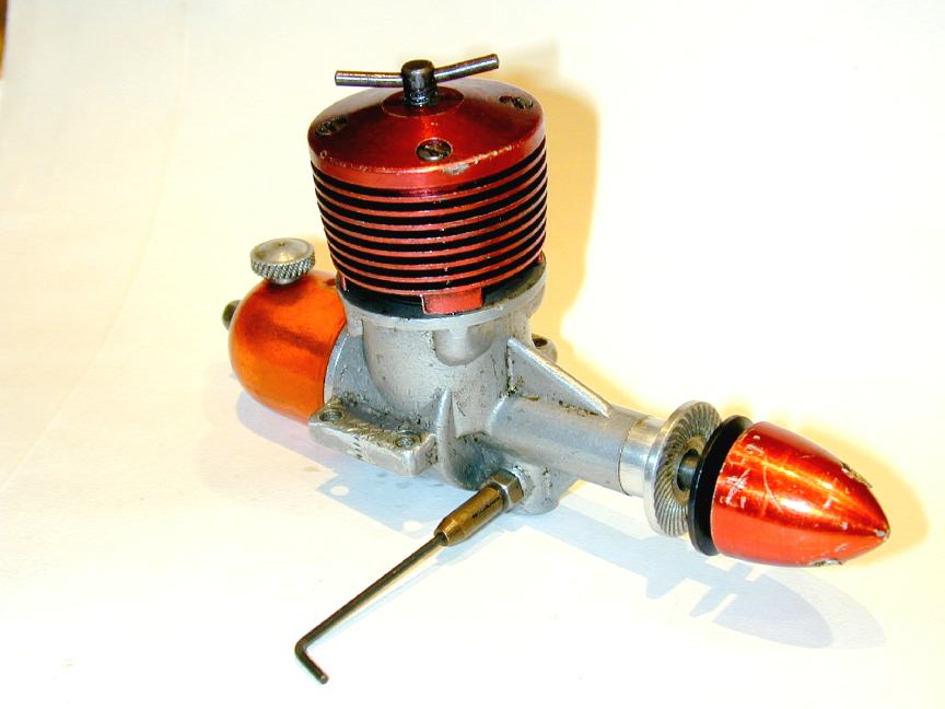 I'm uncertain regarding the color of the tank on my example. It is distinctly orange, though I don't know if this is original, a result of age, or a result of some strange fuel additive (DCO suggested someone had dumped "Redex" in the mix, but he's prone to the occasional leg-pull). Construction is quite conventional: Steel liner, cast iron conical-top pistons, plain bearing, 360 degree porting with a small but noticable amount of sub-piston induction at TDC. Although die-cast, the case is rough enough to be sand cast. This is odd as all other DC engines had quite elegant die-cast cases with fine, intricate, embossed lettering. These features are totally absent on the Manxman. At 6.5 onces, it's sure no light-weight, but most find it attractive and purposful looking.