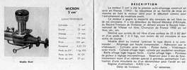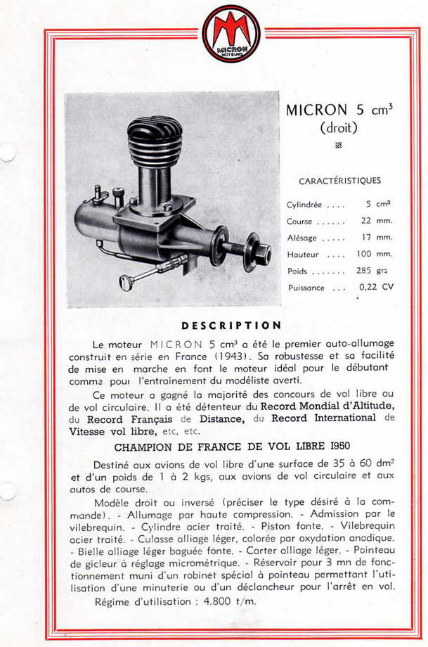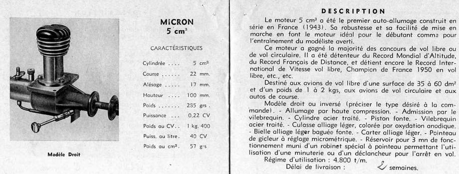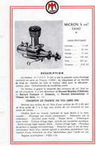 The fixed compression 5cc engines were available in two variants for upright, or inverted operation. This is a version, from David Owen's collection, shows what the Micron catalogue termed the Inversé (inverted) version. The other, featuring an updraft inlet configuration was termed the Droit (right) model. The scans below show the company's catalogue entries for the two engines.