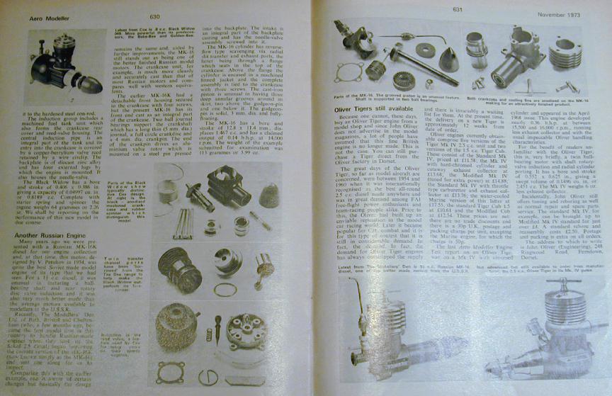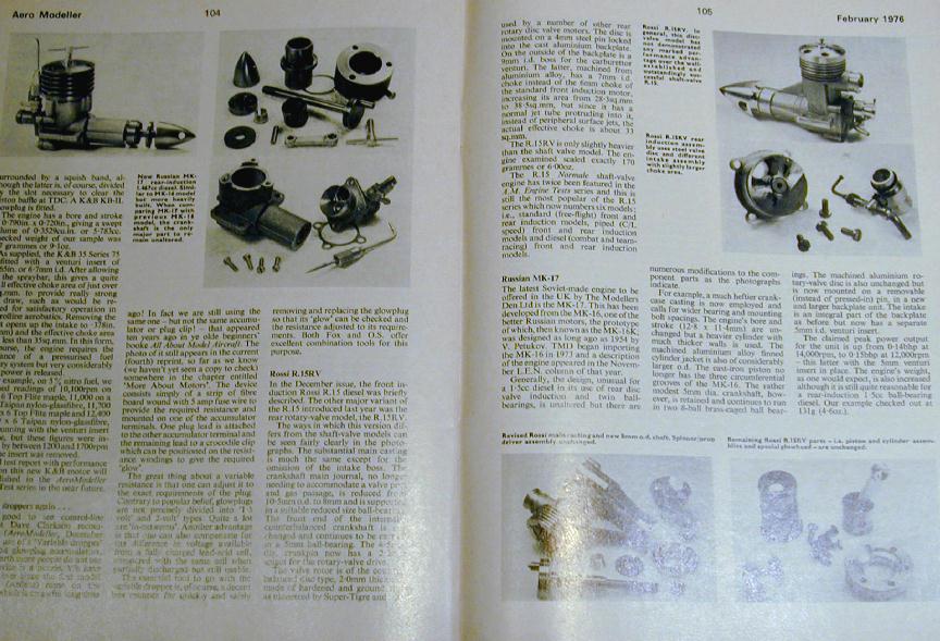 The first hit comes from Peter Chinn's column in the February 1976 issue [2]. Here Peter notes that the Mk 17 is a development of the Mk 16K, and that the latter was designed by one V Petukov, "..as long ago..." as 1956 (so Mr Herbert was quite correct in this impressions). The differences noted by Chinn from this earlier engine include beefing-up of case casting, cylinder liner, cooling fin muff, and the removal of three circumfrential oil grooves previously turned in the piston skirt, two above and one below the wrist pin. He also notes that the 16K was first imported into the UK in 1973. He states that the claimed power output from the Mk 17 was 0.14 bhp at 14,000 rpm.