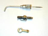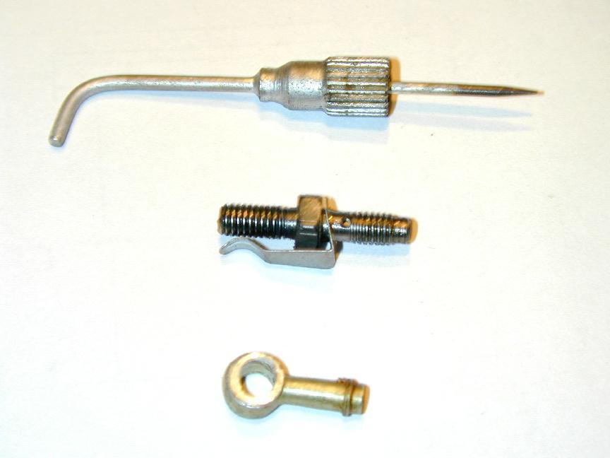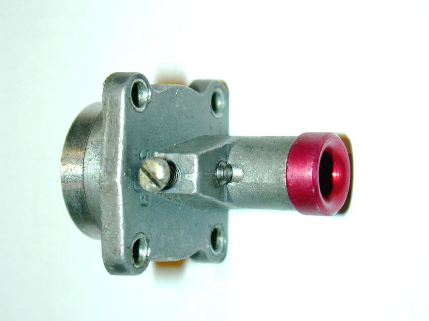 Completing the back-end of the engine, we have the slightly unconventional needle valve assembly. This comprises a piece of hex steel, turned down on either end and threaded. One end carries the needle valve; the other screws into the backplate casting. When tightened up, it protrudes roughly half way into the inlet and locks down the needle ratchet clicker and the fuel banjo, as well as holding the venturi insert in place. The banjo fitting is a nice touch, normally confined to more expensive engines. But closer examination shows some cost savings that are either crude, or smart, depending on your philosophical point of view. The spray bar is drilled through diameterically, not for fuel delivery but for fuel pick-up. Delivery is from a fine jet in the end. The needle seats neatly on the small, just protruding slightly when fully closed. The hole in the banjo is is 4.3mm; the OD of the spray bar at the jet holes is 2.4mm. So we have a lot of slack. Two thin aluminium washers placed on either side of the banjo form a fuel collection cavity in the area where the spray-bar holes reside. Although it's most unlikely that spray-bar will be centered in this cavity, with two jet holes, there is no way to tighten everything up that won't feed fuel--though some will be better than others. The needle is a bit massive. Hell, the whole thing is a bit massive, but it's innovative and functional. Overall, I gotta say I like it.