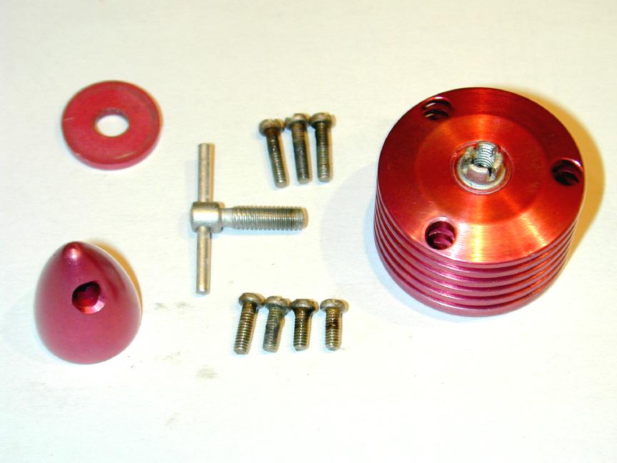 I think one of the nicest features of the Mk 17 is the knurling on the prop drive washer, the corresponding spline molded into the prop, and the way spinner, prop, prop-driver and crankcase journal all neatly match and flow into one streamlined shape. The splines exactly match the knurling. This engine will flick over without sliping with the spinner nut only finger tight. And that knurling job! Normal practice is to plunge knurl by mashing a knurling wheel into the face of the driver disk. A moment's though will tell you that you are applying a speed gradient across the knurl wheel, effectively asking the knurl face on the outside to turn faster than the side on the inside of the driver. Guess what? It can't. So unless special tooling is used (like on Elf engines), the knurl has to slip a gear or two and the pattern produced gets trashed, to some varying degree. You can angle the knurl face to minimise this, but that shows, as does skipping. The Mk 17 knurl (pardon while I rave a bit more) is sodding-well perfect. The inside depth is the same as the outside. It's like it was cut as a little bevel gear, except with no bevel! I'll stop now and just say it's locked to the splindly crank shaft with a tapered collet.